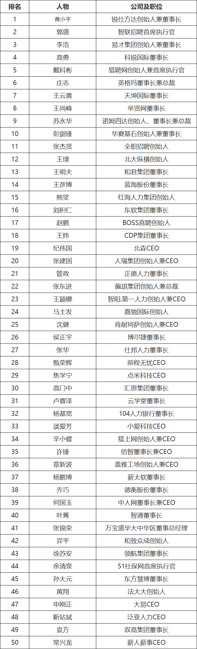 附:2020年中国最具影响力的50位人力资源领袖榜单(奖杯证书、专访请致电:18119647472)