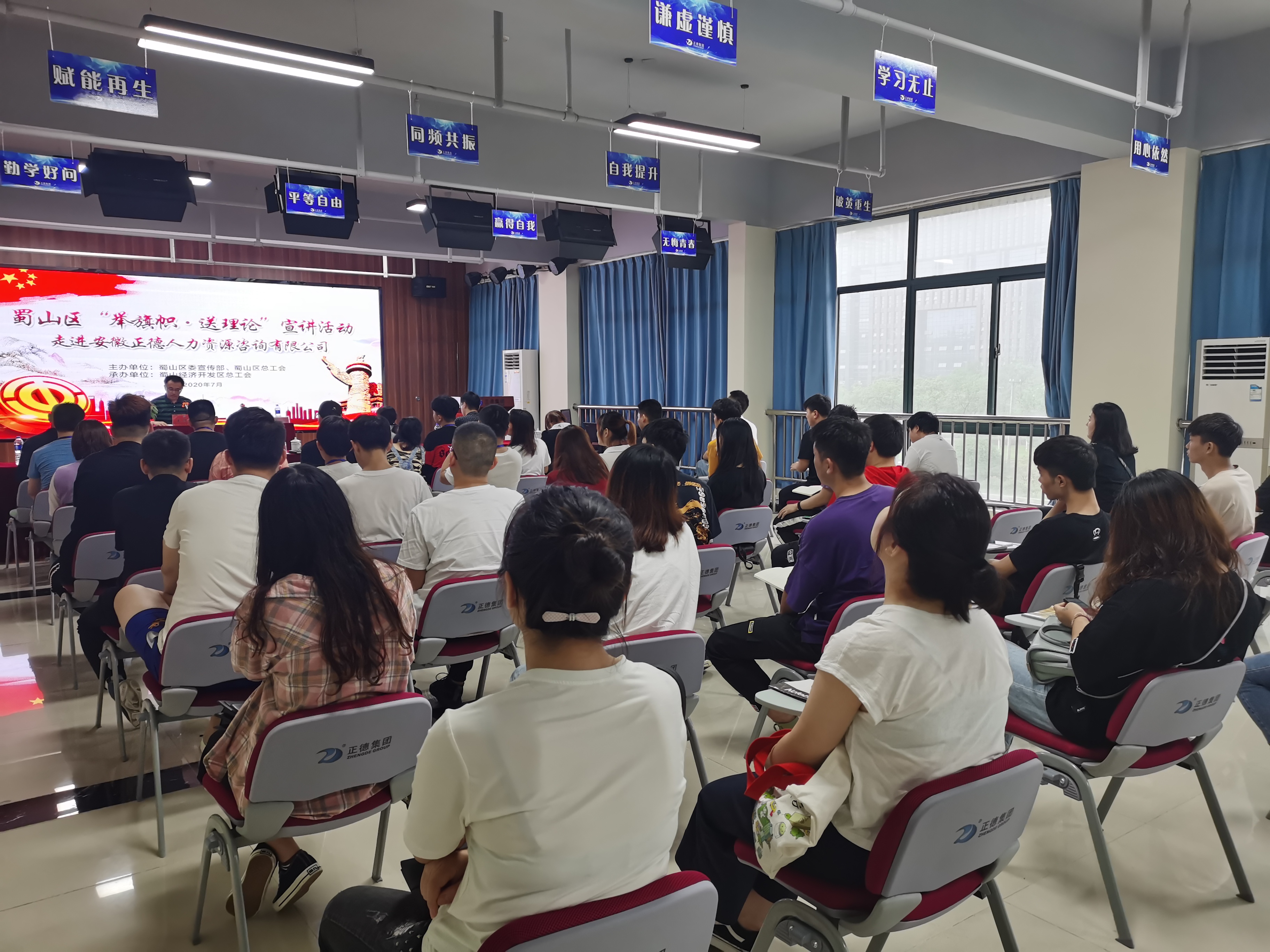 7月28日蜀山区“举旗帜·送理论”宣讲会在安徽正德人力资源咨询有限公司三楼多媒体室开讲。此次活动由蜀山区委宣传部牵头、蜀山区总工会组织,区委宣传部理论科科长姬瑞宁、区总工会副主席陈国锐、蜀山经济开发区总工会专职副主席王圣和参加。活动邀请原合肥市委党校党建部副主任李兵教授授课。正德人力各项目代表共40余人参加了本次宣讲会