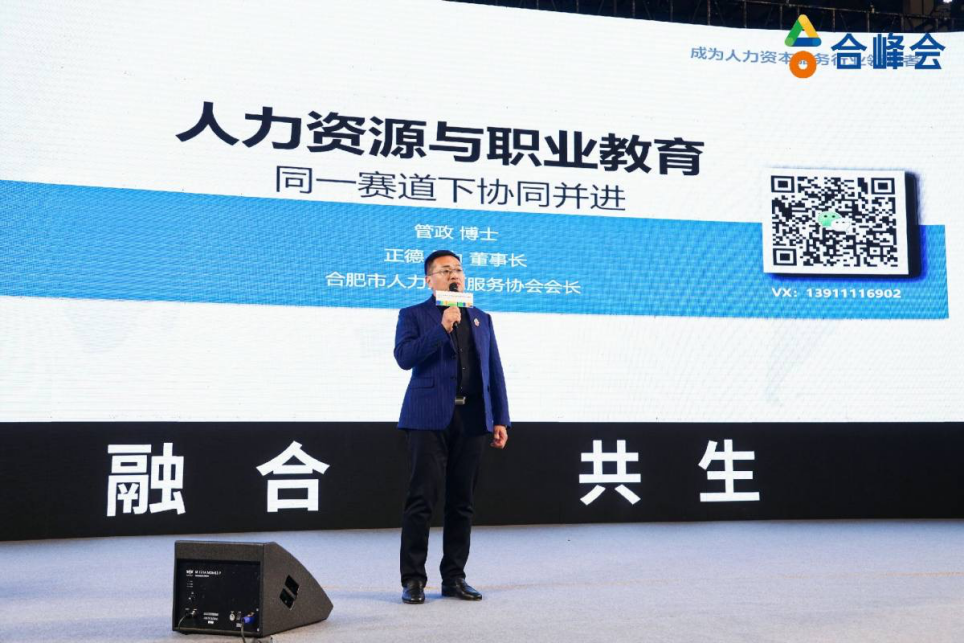 合肥市人力资源服务协会会长,正德人力董事长管政博士,做了《人力资源与职业教育:同一赛道下协同并进》的主题演讲,首先从统领全局的高度,抛砖引玉式的引起参会者的强烈反响与共鸣。