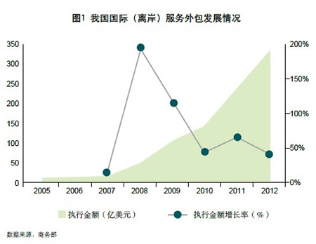产业规模快速扩张。服务外包作为全球价值链管理的非股权模式,不仅仅是企业降低经营成本的重要手段,而是企业有效规避风险、开拓目标市场、培育核心竞争力的战略选择。尽管受世界金融危机影响,全球软件和服务外包市场仍然稳步增长。我国宏观经济环境、基础设施大幅改善,人力资源丰富且质量不断提升,已成为全球最重要的服务外包承接地之一。据商务部统计,2012年我国国际(离岸)服务外包业务执行金额336.4亿美元,2013年将突破400亿美元,持续保持40%左右的高速增长,从业人员规模超过500万人,正日益成为我国国民经济社会发展的新增长极。