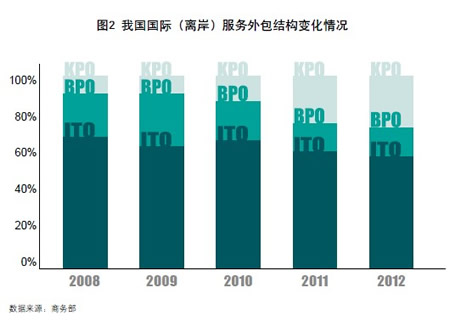 产业层次不断提升。正是信息和通讯技术不断发展增强了服务活动及其过程的可贸易性,世界服务贸易逐渐向新兴服务贸易部门倾斜。以电子信息为主和以高科技为先导的服务外包成为国际服务贸易迅速发展的亮点。我国服务外包发展的初期,国际(离岸)服务外包业务的主要部分也是由信息技术外包(ITO)构成。据我国商务部统计,2008年我国国际(离岸)服务外包业务中约70%业务属于信息技术外包(ITO),而且这些业务主要来自相邻的日本和韩国等地区。随着服务外包促进政策的出台与实施,我国国际(离岸)服务外包业务的市场进一步拓展到更为成熟的欧美市场,业务结构也进一步优化。信息技术外包(ITO)所占比重在波动中呈现明显下降趋势,业务流程外包(BPO)和知识流程外包(KPO)所占比重呈现上升势头。2012年,我国国际(离岸)服务外包业务中,信息技术外包(ITO)离岸业务执行金额比重已降至60%以下。