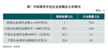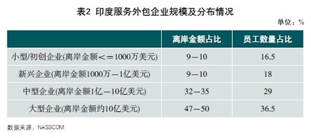 我国服务外包企业规模小。从中国和印度服务外包企业划分类型来看,我国大型服务外包企业离岸金额标准为1亿美元以上;而印度中型服务外包企业离岸金额标准则是1-10亿美元,10亿美元以上的企业才被视为大型服务外包企业。从离岸金额占比企业分布情况来看,印度大型服务外包企业离岸业务占比近50%,大中型服务外包企业离岸业务占比则高达90%以上;而我国则以离岸金额不超过1亿美元企业占据最大比例,离岸金额超过1亿美元企业离岸业务占比不及四分之一。