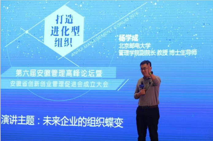管政博士关于如何打造进化型组织透彻分析,赢得了台下的阵阵掌声。其后,北京邮电大学教授,博士生导师,经济管理学院副院长杨学成带来了名为“未来企业的组织蝶变”的主题演讲。杨教授指出:“未来的互联网公司呈现四副画像:1、战略升维2、组织蜕变3、运营越来越智慧化4、管理越来越泛化。企业的进化包括两个方式,一是升维,二是变道。如何去进化?随后杨教授用微信案例来诠释升维,用滴滴案例来诠释变道。