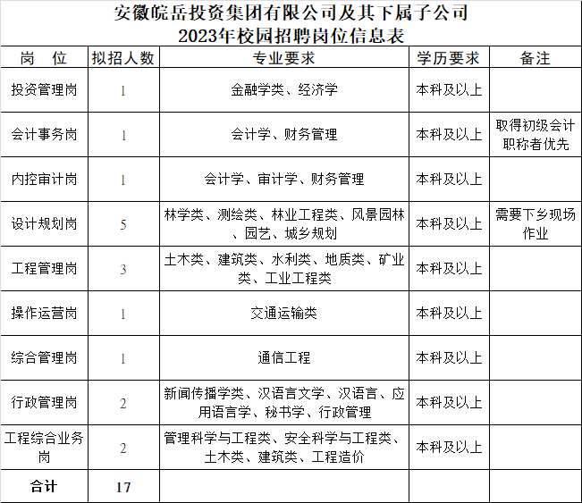 根据工作需要,安徽皖岳投资集团有限公司及其下属子公司拟面向安徽大学、合肥工业大学、安徽财经大学、安徽工程大学、安徽工业大学、安徽建筑大学、安徽理工大学、安徽农业大学、安庆师范大学、安徽师范大学、淮北师范大学2023届毕业生招录17名工作人员,现就有关事项公告如下: